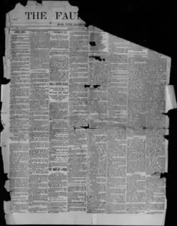 The Quiz was founded in spring of 1892, by John T. Mullins, an 18-year-old resident of Faulkland.[1] Mullins had become interested in the press at a young age and also operated a paper called the Agent's Guide, which was established four years prior to The Quiz.[1][2] Mullins was both publisher and editor of the paper, which "consisted of a bit of local news, a lot of material taken from national wires, and a fair amount of literary text."[1][3] The paper was published once each week, on each Saturday, and featured a motto that included the phrase "For The Masses."[2] Subscriptions cost one dollar, and each edition of the newspaper was four pages long.[2]