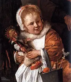 The child near the chimney is holding a symbol of the struggle between Catholics and Protestants, a gingerbread man in the shape of St. Nicholas. The delicacy, still enjoyed around the fifth of December, was seen as an example of Catholic worship of saints and was not approved of by Protestant authorities. In the seventeenth century, the baking of such figures of saints (especially St. Nicholas) was banned. In 1655 in the city of Utrecht an ordinance was passed which forbade "the baking of likenesses in bread or cake".[1]