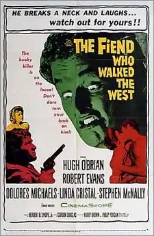 The Fiend Who Walked the West is a 1958 American Western film based on the 1947 film noir Kiss of Death. Almost a horror western, the story involves a psychotic ex-convict terrorising his former cellmate and his family. The director was Gordon Douglas and the film stars Hugh O'Brian, Robert Evans, Dolores Michaels, Linda Cristal, Stephen McNally, and Ron Ely.