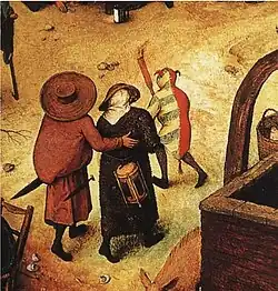 Unlike the group of beggars on the left, who have no audience, the beggars on the right receive the full attention of the churchgoers. Behind the man who is missing both feet and a forearm, a woman is wearing pilgrim insignia, but in the basket on her back is a monkey, which indicates feigning.