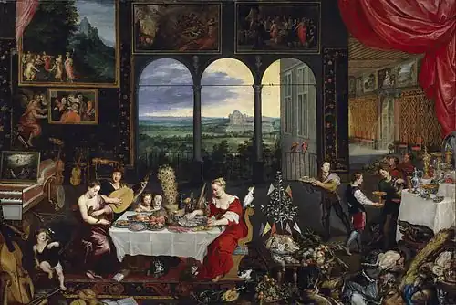 In Taste, Hearing and Touch, the central scene is a meal; a lutenist is playing and children singing, epitomising hearing, while one young woman strokes a mink in her arms, representing touch, and another is about to eat oysters, representing taste. Details such as the clavichord and other musical instruments on the left relate to hearing, and a monkey is pulling the hair of a Cupid, a form of touch. The room and the hall visible in the right rear display pictures which are also related to the three senses: The Annunciation and Minerva's Visit to Parnassus (hearing), The Dentist (touch), and The Punishment of Rich Epulon and The Wedding at Cana (taste).[4]