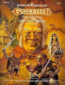 The Five Shires is a sourcebook that details the land of the halflings, who refer to themselves as the Hin.[1] The 24-page "Player's Booklet" presents information on the Shires and their inhabitants, while the 72-page "Dungeon Masters Booklet" describes the history, geography, and more details of the Shire.[1]