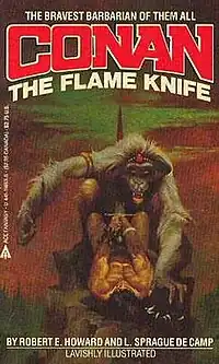 The Flame Knife is a 1955 fantasy novella by American writers Robert E. Howard and L. Sprague de Camp, featuring Howard's sword and sorcery hero Conan the Barbarian. It was revised by de Camp from Howard's original story, a then-unpublished oriental tale featuring Francis X. Gordon titled "Three-Bladed Doom". De Camp changed the names of the characters, added the fantastic element, and recast the setting into Howard's Hyborian Age. The story was first published in the hardbound collection Tales of Conan (Gnome Press, 1955), and subsequently appeared in the paperback collection Conan the Wanderer (Lancer Books, 1968), as part of which it has been translated into German, Japanese, Spanish, Dutch, and Italian. It was published by itself in paperback book form by Ace Books in 1981, in an edition profusely illustrated by Esteban Maroto.
