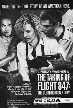 The Taking of Flight 847: The Uli Derickson Story (also known as The Flight[1]) is a 1988 American made-for-television drama film based on the actual hijacking of TWA Flight 847 as seen through the eyes of flight purser Uli Derickson, the chief flight attendant.[2] Derickson herself acted as a consultant for the film. The film was directed by Paul Wendkos and showcases the first 48 hours of the hijacking until Derickson's liberation. The film premiered on NBC on May 2, 1988.[3]