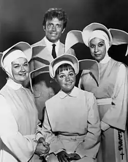During its first two seasons, The Flying Nun aired on Thursday nights at 8:00pm EST, where the series competed in the ratings with Daniel Boone on NBC and Cimarron Strip on CBS.[12] The show was an instant hit, with high ratings and was declared the "hit of the season;" however, the ratings dropped as the season progressed.[13] During its second year, the series was scheduled against Daniel Boone and Hawaii Five-O. During its final season, the series was moved to Wednesday nights at 7:30pm EST, scheduled opposite The Glen Campbell Goodtime Hour. All of the competing shows ranked higher in the ratings than The Flying Nun, which eventually led to its cancellation. During its three-year run, the series was a part of a three-show comedy block on ABC that also consisted of Bewitched and That Girl.[14] Despite its early popularity, the show's ratings never broke the Nielsen top thirty and the final episode aired on April 3, 1970. However, its 83 episodes have consistently attracted new audiences since its initial run.