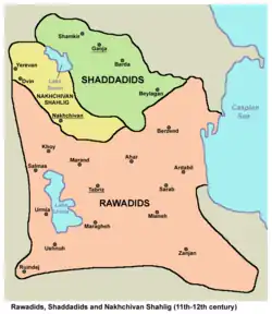 The third part of the book, which is also the last part, is about Shaddadids dynasty. Kasravi in the introduction divides this family into two parts, 1- Shaddadids who ruled in Ganja. 2- Shaddadids who ruled in Ani and Armenia.[24] Introduction The third part is dedicated to introducing the geographical and historical location of Arran until the conquest of Iran by the Arabs. Arran is located in the north of Iran and in the west of the Caspian Sea, and the big cities there are Baku, Ganja, Shamakhi and Derbent, and among the old cities there, Barda is the most important, whose ruins now remain.[25] Regarding the history of Arran, Kasravi introduces its local there as "Arranshahs" and declares that they were a Tributary state of the Sassanids. He wrote that after the escape of Mehran, one of Anushirvan's relatives to Arran, 30,000 Iranian families joined him until one of the members of Anushirvan's relatives (that later formed Mihranids) named Varaz Gregor, who had converted to Christianity, overthrew the Arranshahs family. And during the help of Yazdgerd III, he sent his son named Javanshir to help of the Sassanid army. But after the death of Yazdgar III, Javanshir returned to Aran and after the Arabs entered Arran, Javanshir obeyed them.[26]