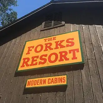 Fred Spenhoff first established The Forks Resort in 1926. The initial setup included four cabins, a general store, and a sawmill.[3] Later, Bob Miller took over the property and constructed a new store building. Unfortunately, a fire in September 1949 destroyed the building. Despite this setback, a larger and more modern structure was built in the following season.[4] The resort has stayed within the family, transitioning from Bob Miller to his daughter Pat and her husband Frank Hopkins, and eventually to their daughter Leslie Cox and her husband Ron.[5]