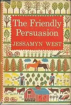 The Friendly Persuasion is an American novel published in 1945 by Jessamyn West.[1] It was adapted as the Oscar-nominated motion picture Friendly Persuasion in 1956.[2] The book consists of 14 vignettes about a Quaker farming family,[3] the Birdwells, living near the town of Vernon in southern Indiana[1] along "the banks of the Muscatatuck, where once the woods stretched, dark row on row."[4] The Birdwells' farm, Maple Grove Nursery, was handed down to them by pioneering forebears who came west nearly fifty years before the time period depicted at the outset of the novel.
