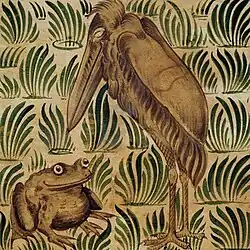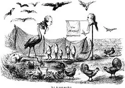 As soon as the French had their own experience of regime-change, illustrators began to express their feelings through this fable too. A cartoon dating from 1791 and titled Le roi soliveau, ou les grenouilles qui demandent un roi (King Log, or the frogs demand a king)[9] wryly portrays those responsible for the Champ de Mars massacre.[10] In the following century, the caricaturist Grandville turned to illustrating La Fontaine's fables after a censorship law made life difficult for him. There it is a recognisably imperial stork who struts through the water wearing a laurel crown, cheered on one side by sycophantic supporters and causing havoc on the other.[11] Ernest Griset, the son of French political refugees from yet another change of regime, followed the same example. His horrific picture of a gruesome skeletal stork seated on a bank and swallowing his prey appeared in an 1869 edition of Aesop's fables.[12] It is his comment on the Second French Empire that had driven his parents into exile.