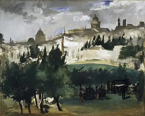 It shows a hearse and its attendants at the bottom of the quartier Mouffetard, heading for the Montparnasse Cemetery, with the Observatoire de Paris, église Notre-Dame du Val-de-Grâce, the Panthéon, the bell tower of the église Saint-Étienne-du-Mont and the tour Clovis (now the lycée Henri-IV) in the distance.[3] Charles Sterling-Salinger notes that Manet has brought the domes of the Observatoire of the église Notre-Dame du Val-de-Grâce closer together to improve the composition.[4] According to Adolphe Tabarant, the scene is set in the rue de l'Estrapade.[5] Tabarant initially dated the work to 1870, but later amended this to the earlier date, which he felt more probable. Due to the presence of a horse grenadier of the Imperial Guard at the back of the procession, Henri Loyrette argues that the scene is set before the end of the French Second Empire.[6]
