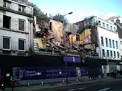 In April 2016 emergency work had to be carried out to make the building safe, with what safety inspectors described as "internal collapse, leaning walls and a high risk that cladding tiles may fall off".[15] Works to be carried out included the demolition of the facade in May. Structural reports regarding the facade were highly controversial with original reports by Sutcliffe being discredited by heritage specialists Morton Partnerships[16] who found that the construction of the facade were made of hollowed blocks rather than tiles as previously assumed. They found no significant threat of cladding 'tiles' falling off but recommended the removal and retention of the post WWII pediment which was not secured appropriately. Liverpool Council attempted to demolish the facade while the court appeal was ongoing but campaigners were able to obtain a block on this in time. The pediment was removed in line with what was suggested by Morton Partnership.[17] In August the same year, a legal challenge to save the building's facade was rejected, with the council declaring it beyond repair.[18] By September the building had been completely demolished.[19]