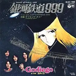 Galaxy Express 999 (銀河鉄道999, Ginga Tetsudō Surī Nain) is a song by Japanese rock band Godiego, released as their 11th single. The song was used as the theme song for the 1979 film adaptation of the manga of the same name. The song was composed by Godiego vocalist Yukihide Takekawa and arranged by Godiego keyboardist Mickie Yoshino. Like many Godiego songs, it is both in Japanese and English; the English lyrics were written by Yōko Narahashi and the Japanese lyrics were written by Keisuke Yamakawa. The song reached #2 on the Oricon charts and was the #1 song on The Best Ten for seven weeks.