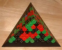 It contains a triangular base plate and 281 dice of four different colours, and a rule book that gives rules for some 50+ games. Most of the games are centered on building or demolishing pyramids of dice, but there are also racing games and games of skill. The game has been originally published by Diego Rodriguez (Reinhold Wittig), Göttingen, in 1979.[1][2][4][5]