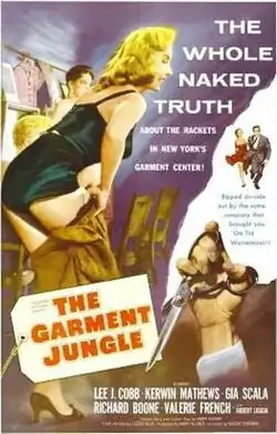 The Garment Jungle is a 1957 American film noir crime film directed by Vincent Sherman and starring Lee J. Cobb, Kerwin Mathews, Gia Scala, Richard Boone and Valerie French.[3]