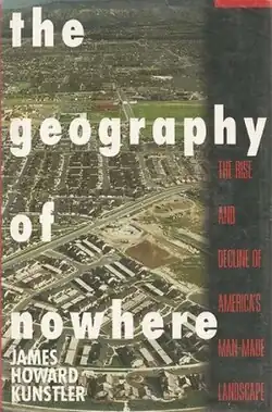 The Geography of Nowhere: The Rise and Decline of America's Man-Made Landscape is a book written in 1993 by James Howard Kunstler exploring the effects of suburban sprawl, civil planning, and the automobile on American society and is an attempt to discover how and why suburbia has ceased to be a credible human habitat, and what society might do about it.[1][2][3][4] Kunstler proposes that by reviving civic art and civic life, we will rediscover public virtue and a new vision of the common good: "The future will require us to build better places," Kunstler says, "or the future will belong to other people in other societies."[5][6]
