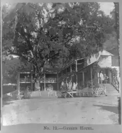 Between 1848 and 1854, Archibald C. Godwin developed The Geysers into a spa named The Geysers Resort Hotel, which attracted tourists including Ulysses S. Grant, Theodore Roosevelt and Mark Twain.[5][8][9] The resort declined in popularity in the mid 1880s, and rebranded itself to appeal to lower-income people.[5] In 1938, the main building was destroyed in a landslide although the bar/restaurant, small cabins and the swimming pool stayed open, despite another fire in March 1957, until about 1979.[5] In 1960, Pacific Gas and Electric began operation of their 11-megawatt geothermal electric plant at the Geysers. Unocal Corporation dismantled the remains of the resort in 1980.[5]