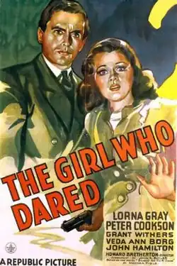 The Girl Who Dared is a 1944 American mystery film directed by Howard Bretherton and written by John K. Butler. It is based on the 1942 novel "Blood On Her Shoe" by Medora Field. The film stars Lorna Gray, Peter Cookson, Grant Withers, Veda Ann Borg, John Hamilton and Willie Best. The film was released on August 5, 1944, by Republic Pictures.[1][2][3]