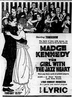 The Girl with the Jazz Heart is a 1921 American silent comedy film directed by Lawrence C. Windom and written by Philip Lonergan and George Mooser. The film stars Madge Kennedy, Joe King, Pierre Gendron, William Walcott, Helen Dubois, and Robert Vaughn. It was released on January 7, 1921, by Goldwyn Pictures.[1][2][3]