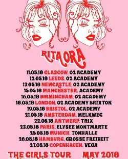 The Girls Tour was the third concert tour by British singer Rita Ora, which served as a prelude to her, then upcoming, second studio album, Phoenix (2018). The promotional concert tour began on 11 May 2018 in Glasgow, Scotland.[1][2][3]