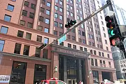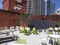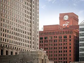 The Gogo Building, formerly known as the River Center, is an 840,000-square-foot (78,000 m2) commercial building located at 111 N. Canal Street in the West Loop community area of Chicago, Illinois. Originally constructed as a warehouse in the early 1900s, the vintage, loft-style building is now home to various commercial tenants, most notably Gogo Inflight Internet, which has its logo on the cube topping the building. Other tenants include Twitter, Uber, Vivid Seats, SAP Fieldglass, Potbelly Sandwich Works and Kin + Carta.[1] The building is one of the best surviving examples in downtown Chicago of the once vibrant industrial district along the Chicago River.[2]
