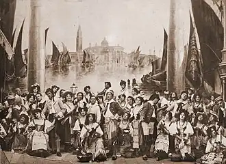 A new production, with new sets and costumes designed by Charles Ricketts, was prepared for the opening of the renovated Savoy Theatre on 21 October 1929.[7] The critic Ernest Newman wrote: "It was a subtle stroke to open with The Gondoliers; there is a peculiar richness of blood in the music of this work that makes the new theatre and the new designs and dresses by Mr. Charles Ricketts particularly appropriate."[24] The performance was conducted by Malcolm Sargent,[25] and the theatre's only box was occupied by Lady Gilbert.[26] Peter Goffin designed new touring sets in 1957,[7] and another notable new production was staged by the company in 1958 at the Princes Theatre with sets and costumes by Goffin.[7][27] In 1967, new costumes were designed by Luciana Arrighi, with new sets by John Stoddart.[28]