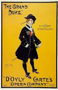 The Grand Duke; or, The Statutory Duel, is the final Savoy Opera written by librettist W. S. Gilbert and composer Arthur Sullivan, their fourteenth and last opera together. It premiered at the Savoy Theatre on 7 March 1896, and ran for 123 performances. Despite a successful opening night, the production had a relatively short run and was the partnership's only financial failure, and the two men never worked together again. In recent decades, the opera has been revived professionally, first in the US and then in the UK.