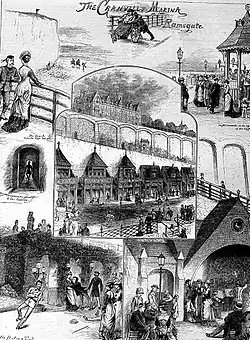 This magnificent promenade and carriage drive has been constructed for the purpose of affording a more direct means of communication between the Upper East Cliff and the railway station on the sands below. The idea originated with the proprietor, Mr Edmund F Davis, who, with the assistance of Mr J T Wimperis, the architect, has succeeded in giving Ramsgate a novel and most delightful attraction. The main object was, of course, the zig-zag roadway cut out of the cliff, but with this was incorporated a scheme for its embellishment which has been most successfully carried out. The erewhile dreary-looking cliff has been transformed into a charming garden, and along the perpendicular rock excavations have been made an fitted up in quaint Old English style of architecture with shops, restaurants etc, and there are a number of clever-contrived subways and flights of steps, which serve as short cuts from one part of the cliff to another. At the “elbow” of the winding roadway stands the “Establishment,” which is to be devoted to musical and other attractive entertainments. This building is in the same style as the shops, and is constructed of red brick with white stone carvings. The entrance has a noble façade, above which is a large circular window containing the Granville Arms; and windows of stained glass, with allegorical symbols of Music and the sister arts. The hall is fifty feet wide and more than 100 feet in length. It is tastefully decorated in colour and gold, and lighted by an ornamental skylight and side windows of tinted glass, and the recesses around the walls are arranged as an aquarium and winter gardens. Some idea of the enormous difficulties which had to be surmounted, and were actually overcome in the short space of three months, may be gathered from the following facts and figures: 80,000 tons of chalk were removed from the cliff. The materials used in the construction included 2,500,000 bricks, 15,000 cubic feet of timber, 50,000 superficial feet of boarding, 1,000 cubic feet of stone; 1,200 loads of sand, 300 of flints, 200 of gravel, 450 tons of cement, 300 of lime, and 4 of nails, 130,000 tiles, 8,000 feet of glass, 78 tons of ironwork, and more than 7,000 feet of iron piping.