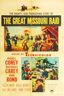 The Great Missouri Raid is a 1951 American Western released by Paramount Pictures[1][2][3] starring Wendell Corey, Macdonald Carey, and Ward Bond, with Ellen Drew, Bruce Bennett, Bill Williams and Anne Revere in support. It was directed by Gordon Douglas and written by Frank Gruber.