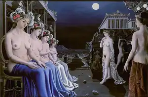 The picture depicts a group of partially nude women in moonlight, sitting motionless before a hill bearing two Greco-Roman style buildings. According to the description from the Metropolitan Museum of Art, the setting "reveals the painter's admiration of the work of Giorgio de Chirico". The women in the foreground are unashamedly if not threateningly seductive, and in the distance mermaids are working their magic on a lone individual in a bowler hat. The whole composition evokes fantasies of erotic love.[1]