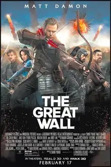 The Great Wall (simplified Chinese: 长城; traditional Chinese: 長城) is a 2016 monster film directed by Zhang Yimou, with a screenplay by Carlo Bernard, Doug Miro and Tony Gilroy, from a story by Max Brooks, Edward Zwick and Marshall Herskovitz. An American and Chinese co-production starring Matt Damon, Jing Tian, Pedro Pascal, Willem Dafoe, and Andy Lau, the plot centers on two European mercenary warriors (Damon and Pascal) imprisoned by imperial Chinese forces within the Great Wall of China after arriving in search of gunpowder, eventually joining forces with the Chinese to help combat an alien threat. The Great Wall is Zhang's first English-language film.[5]