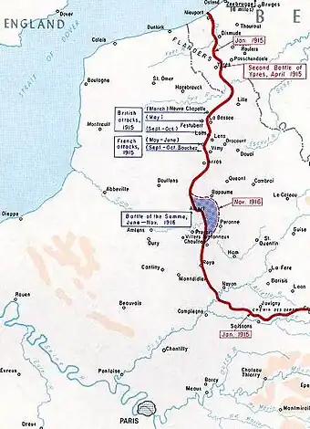 Tolkien was attached to the Lancashire Fusiliers who fought in the Battle of the Somme from September 1916. Tolkien's battalion stayed in reserve for the first week. It went into action at Ovillers, Tolkien's company again staying in reserve to carry supplies. Tolkien became battalion signals officer and often worked close to the front line. The battalion helped to win the Battle of Thiepval Ridge in late September, and took part in the capture of Regina Trench in late October. On 25 October, he went down with trench fever, and was sent home a fortnight later.[4][5][6][7]