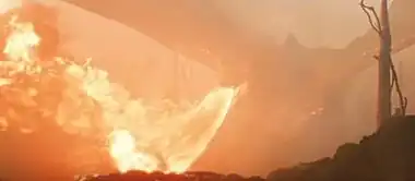 The Finnish film director Dome Karukoski's 2019 biographical drama film Tolkien narrates Tolkien's early life and wartime experiences. It depicts him in delirium with trench fever on the front line,[39] beginning "to hallucinate scenes from the books he is yet to write",[40] and thus visually linking the war to his legendarium. In a vision, perhaps dreamed, in a smoky, dark and chaotic no man's land of mud and shattered tree-stumps, he sees not a Flammenwerfer but a fiery dragon before him.[38][39] He also has a batman named Sam.[38] Sheila O'Malley, reviewing the film for the film criticism website RogerEbert.com, comments that having Tolkien literally "see[ing] dragons and what would eventually become the Eye of Sauron and the Nazgûl, unfurling across the hellscape of No-man's-Land ... is a very reductive approach to literature". Worse, in O'Malley's view, is that by explicitly showing the Somme as "'inspiration'" (her quotation marks) for Middle-earth, the film "diminish[es] both the battle and the books".[1]
