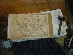 The earliest ukiyo-e works, Hishikawa Moronobu's paintings and monochromatic prints of women, emerged in the 1670s.[6] Colour prints were introduced gradually, and at first were only used for special commissions. By the 1740s, artists such as Okumura Masanobu used multiple woodblocks to print areas of colour.[7] In the 1760s, the success of Suzuki Harunobu's "brocade prints" led to full-colour production becoming standard, with ten or more blocks used to create each print. Some ukiyo-e artists specialized in creating paintings, but most works were prints.[8] Artists rarely carved their own woodblocks; production was divided between the artist, who designed the prints; the carver, who cut the woodblocks; the printer, who inked and pressed the woodblocks onto hand-made paper; and the publisher who financed, promoted, and distributed the works. As printing was done by hand, printers were able to achieve effects impractical with machines, such as the blending or gradation of colours on the printing block.[9]