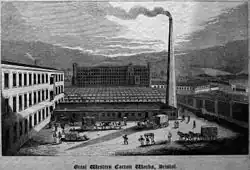 The Great Western Cotton Factory was opened on a site in Barton Hill, Bristol in April 1838[1] to spin and weave cotton into cloth.[2] The cotton processed at the factory was brought from America to the port of Liverpool and carried by water to Bristol.[3] It was the only example of a cotton mill in South West England, most other factories being in Lancashire, Yorkshire, Cheshire and Derbyshire.[3]