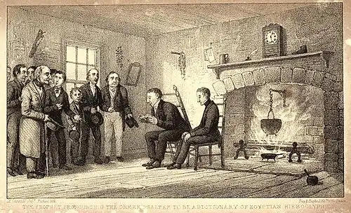 After looking the manuscript over, Smith identified the manuscript as being a dictionary of Egyptian hieroglyphics, pointing to the capitalized letters saying that they were hieroglyphics followed by their meanings in reformed Egyptian. Caswall went on to claim that this was evidence of Smith's position as a fraud.[1][2][3] A local newspaper, the Warsaw Message, also mentioned the event and stated that multiple supporters of Smith were also present during the event.