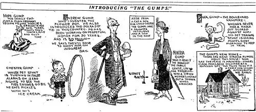 The Gumps made its debut in an unusual way. Cartoonist Sidney Smith had previously drawn and written Old Doc Yak, a talking-animal strip that sustained only a brief run. The very last Old Doc Yak strip depicted Yak and his family moving out of their house, while wondering who might move into the house next. On Thursday, February 8, 1917, the last panel showed only the empty house. On Monday, February 12, 1917, after the Gumps were introduced in the space formerly occupied by Old Doc Yak, they moved into the house formerly occupied by the Yak family. (Old Doc Yak would reappear as a topper for The Gumps Sunday page from 1930 to 1934.)