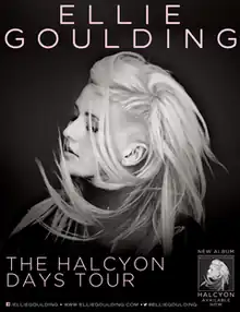 On 13 September 2012, it was announced that Goulding would embark on a nine-date tour across the United Kingdom.[1] The tour's official name, The Halcyon Days Tour, was unveiled on 22 October 2012, along with North American dates, which will kick off in Miami Beach on 16 January 2013. "I'm so excited to start touring my new album Halcyon properly. I'm incredibly proud of this record and the reaction has been over-whelming. Touring and playing shows is my favorite part of what I do, and I really can't wait to get on the road", Goulding said.[2] Additional European dates followed on 15 November 2012.[3]