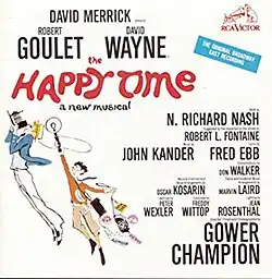 The Happy Time opened on Broadway at The Broadway Theatre on January 18, 1968. It received mixed reviews from the critics, who generally admired the performances but noted large deficiencies in the script.[8] It closed on September 28, 1968, after a run of 286 sparsely attended performances and 23 previews. It was the first Broadway musical to lose a million dollars.[9] The production was directed, filmed, and choreographed by Gower Champion, set design by Peter Wexler, costume design by Freddy Wittop, lighting design by Jean Rosenthal, film sequences created by Christopher Chapman, film technical direction by Barry O. Gordon, orchestrations by Don Walker, musical direction and vocal arrangements by Oscar Kosarin, associate choreography by Kevin Carlisle, and dance and incidental music arrangements by Marvin Laird. John Serry Sr. collaborated as the orchestral accordionist in the Broadway production.
