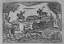 "The Hare and many friends" was the final fable in John Gay's first collection of 1727.[1] It concerns the inconstancy of friendship as exemplified by a hare that lives on friendly terms with the farm animals. When the horns of the hunt are heard, she panics and eventually collapses exhausted, begging each of her acquaintances to help her escape. All give her different excuses, the last being a "trotting calf" who bids her "Adieu" as the hunters burst onto the scene. The poem won widespread popularity for some 150 years afterwards but, on a prose version appearing in a collection of Aesop's Fables, Gay's original authorship has gradually become forgotten.