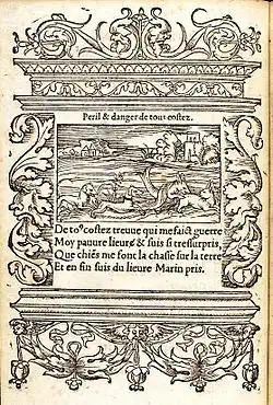The subject of the hare's fate was subsequently taken up in Latin by Ausonius in a four-line epigram reliant upon the Greek poems.[2] The situation also figured in Gilles Corrozet's Hecatomographie (1540). This was an Emblem book in which the story's significance was widened to the uncertainty of life in general under the title "Peril and danger on all sides" (see illustration).