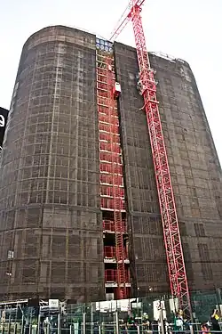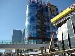 In March 2010, MGM called the Harmon a "total loss" and removed Perini, bringing an end to construction and postponing completion indefinitely.[3] MGM had spent $275 million on the project,[31] which remained as a largely empty shell for the rest of its existence.[32] Later that month, Perini filed a lawsuit and mechanic's lien against MGM and Dubai World, seeking to collect $492 million in unpaid CityCenter construction bills, relating primarily to the Harmon.[33][34] MGM filed a counterclaim, to which Perini responded, "They either don't want to or don't have the ability to pay."[3] In July 2010, Clark County District Court judge Elizabeth Gonzalez ordered that Perini be allowed back on-site to conduct an inspection for its lawsuit.[35] By the end of 2010, MGM wanted to demolish the Harmon.[36] The building's exterior, by that point, was being used as a billboard for other CityCenter attractions.[36][37][38]