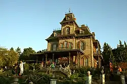 Disney, however, rejected the idea of having a run-down building in his park.[3] He visited the Winchester Mystery House in San Jose, California, and was captivated by the massive mansion with its stairs to nowhere, doors that opened to walls and holes, and elevators.[4] Anderson envisioned stories for the mansion, including tales of a ghostly sea captain who killed his nosy bride and then hanged himself, a mansion home to an unfortunate family, and a ghostly wedding party with well-known Disney villains and spooks.[3]
