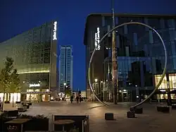 Alliance is a 25 metres (82 ft) high sculpture in The Hayes. The sculpture consists of a large stainless steel and enamelled metal arrow column and a hoop, which glows in the dark, and falls and rises with the tide. Paid for by the St David's shopping centre as part of a £1.5m public art scheme in the city centre, it was installed in the space between the new mall and Cardiff Central Library[4]