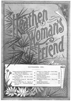 This article incorporates text from this source, which is in the public domain: Woman's Foreign Missionary Society (1895). The Heathen Woman's Friend. Vol. 27 (Public domain ed.). Woman's Foreign Missionary Society of the Methodist Episcopal Church.