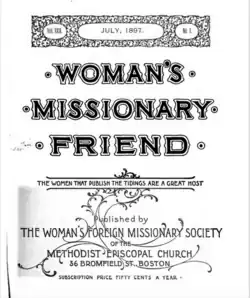 By 1911, the publisher was Annie G. Bailey, with Elizabeth C. Northup as Editor; the subscription price was $0.50 per year. The editor of the German language version, Der Frauen-Missions-Freund was Amalie M. Achard, of Elgin, Illinois; subscription price was $0.26 per year.[13] The publication merged into Methodist Woman in 1940.[14][15]