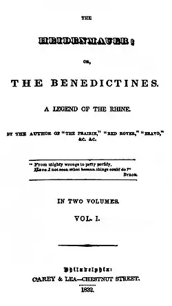 The Heidenmauer; or, The Benedictines – A Story of the Rhine is a novel by James Fenimore Cooper, first published in 1832. The novel is a socio-political novel set in 16th-century Germany that focuses on the competition between various socio-political classes and the tension caused by the Reformation. The Heidenmauer is Cooper's second novel in what one critic would call his European Trilogy, following The Bravo and preceding The Headsman.[1] Like the other novels set in Europe, The Heidenmauer is intent on showing the darker side of European institutions in favor of an American perspective.[2]