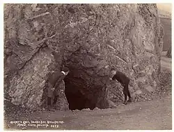 His cave was boarded up and partially destroyed when Queens Drive was built in 1894.[7]