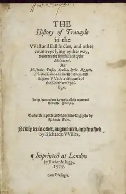 - ^ "The history of trauayle in the VVest and East Indies, and other countreys lying eyther way, towardes the fruitfull and ryche Moluccaes : As Moscouia, Persia, Arabia, Syria, Ægypte, Ethiopia, Guinea, China in Cathayo, and Giapan : Vvith a discourse of the Northwest passage / Gathered in parte, and done into Englyshe by Richarde Eden. Newly set in order, augmented, and finished by Richarde VVilles. - Yale University Library". brbl-dl.library.yale.edu. Retrieved 17 July 2020.