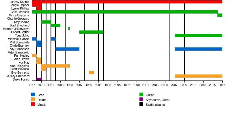 - Chris Masuak (1977–84, 1989–92): Holmgren, Magnus. "Chris Masuak". Australian Rock Database. Archived from the original on 29 December 2003. Retrieved 23 June 2017.