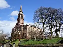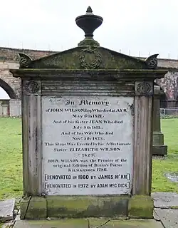 The High Church in Kilmarnock was greatly altered in 1868 with stained glass, an organ provided and other improvements made. Burns's first printer, John Wilson, was buried in the kirkyard. The building is no longer in use as a church however the kirkyard can still be accessed.[18]